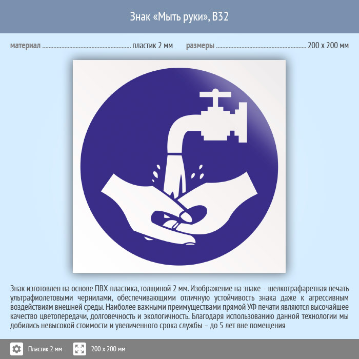 Знак «Мыть руки», B32 (пластик, 200х200 мм) в Верее купить