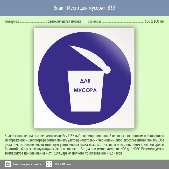 Знак «Место для мусора», B33 (пленка, 100х100 мм) в Верее купить