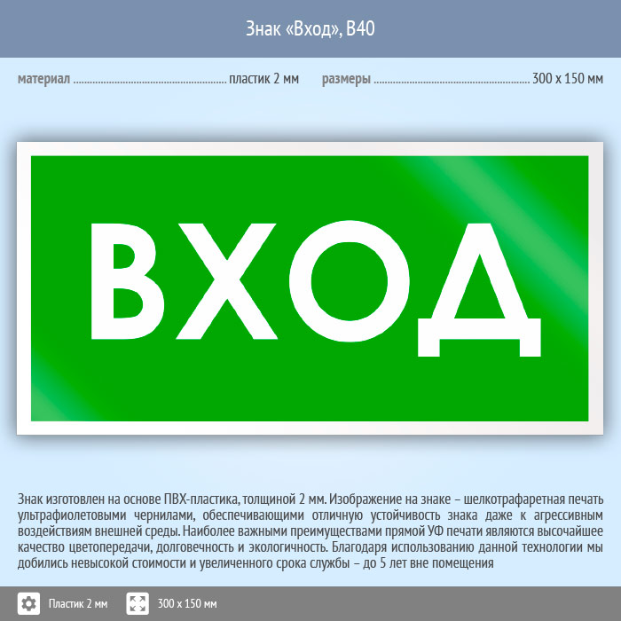 Знак «Вход», B40 (пластик, 300х150 мм) в Верее купить