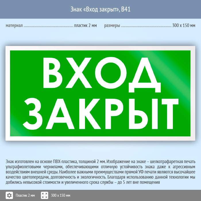 Знак «Вход закрыт», B41 (пластик, 300х150 мм) в Верее купить
