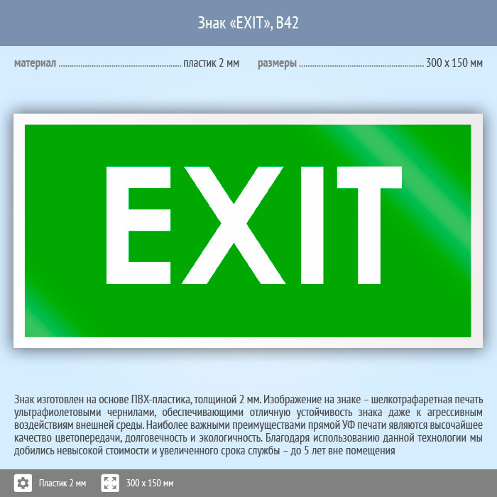 Знак «EXIT», B42 (пластик, 300х150 мм) в Верее купить