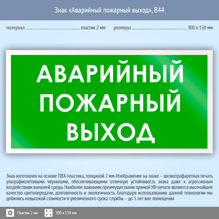 Знак «Аварийный пожарный выход», B44 (пластик, 300х150 мм) в Верее купить