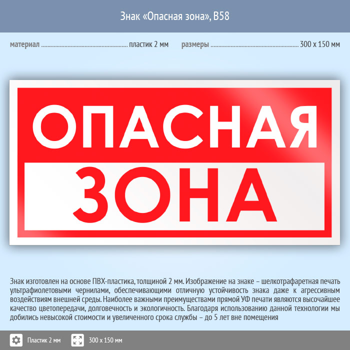 Знак «Опасная зона», B58 (пластик, 300х150 мм) в Верее купить
