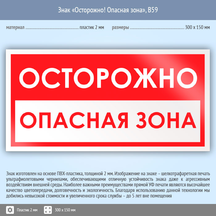 Знак «Осторожно! Опасная зона», B59 (пластик, 300х150 мм) в Верее купить