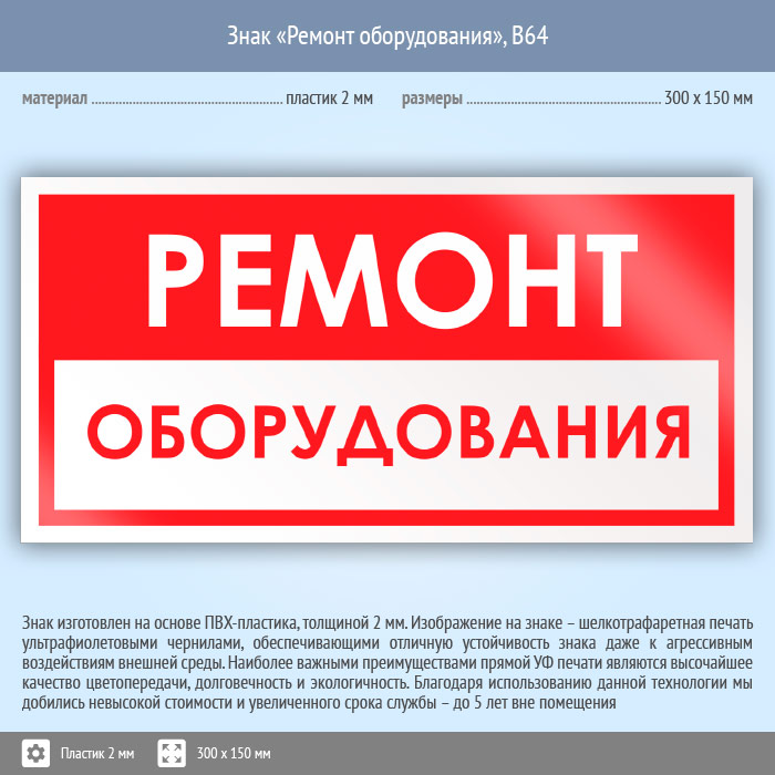Знак «Ремонт оборудования», B64 (пластик, 300х150 мм) в Верее купить