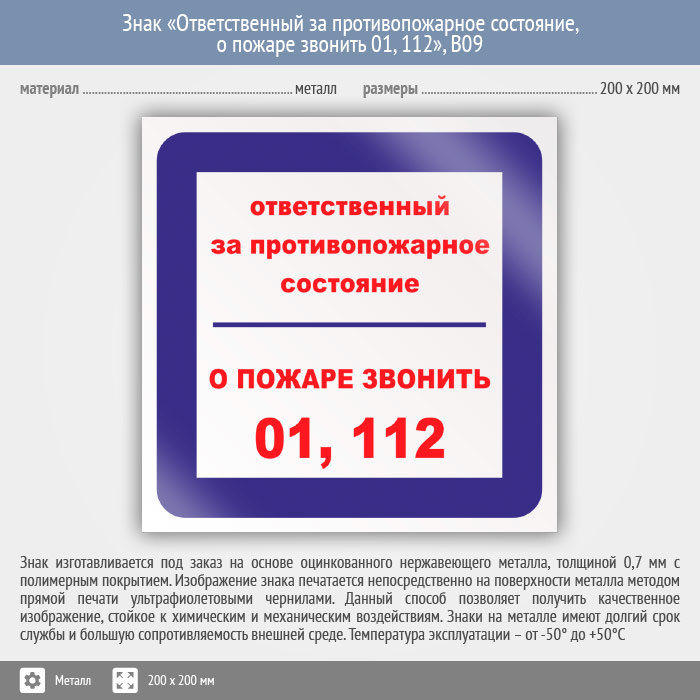 Знак «Ответственный за противопожарное состояние, о пожаре звонить 01, 112», B09 (металл, 200х200 мм) в Верее купить