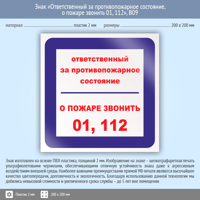 Знак «Ответственный за противопожарное состояние, о пожаре звонить 01, 112», B09 (пластик, 200х200 мм) в Верее купить