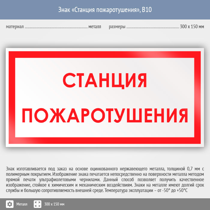 Знак «Станция пожаротушения», B10 (металл, 300х150 мм) в Верее купить