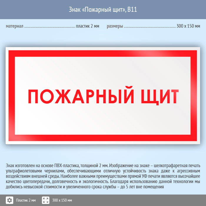 Знак «Пожарный щит», B11 (пластик, 300х150 мм) в Верее купить
