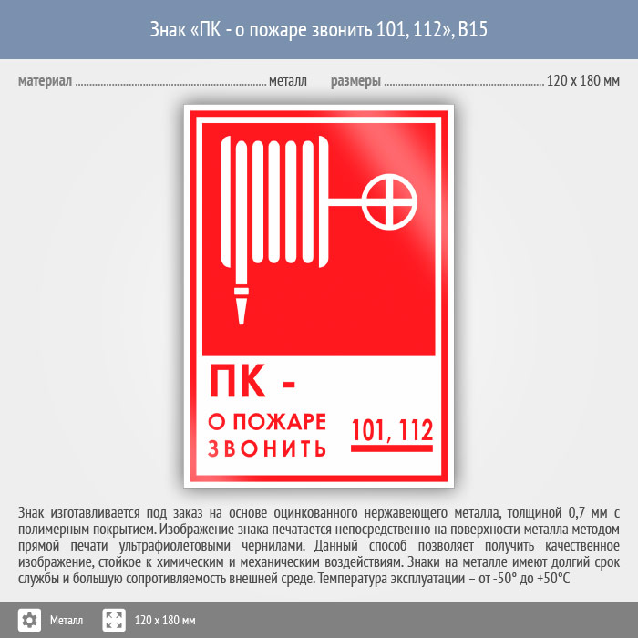 Знак «ПК - о пожаре звонить 101, 112», B15 (металл, 120х180 мм) в Верее купить