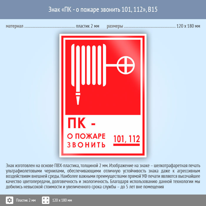 Знак «ПК - о пожаре звонить 101, 112», B15 (пластик, 120х180 мм) в Верее купить