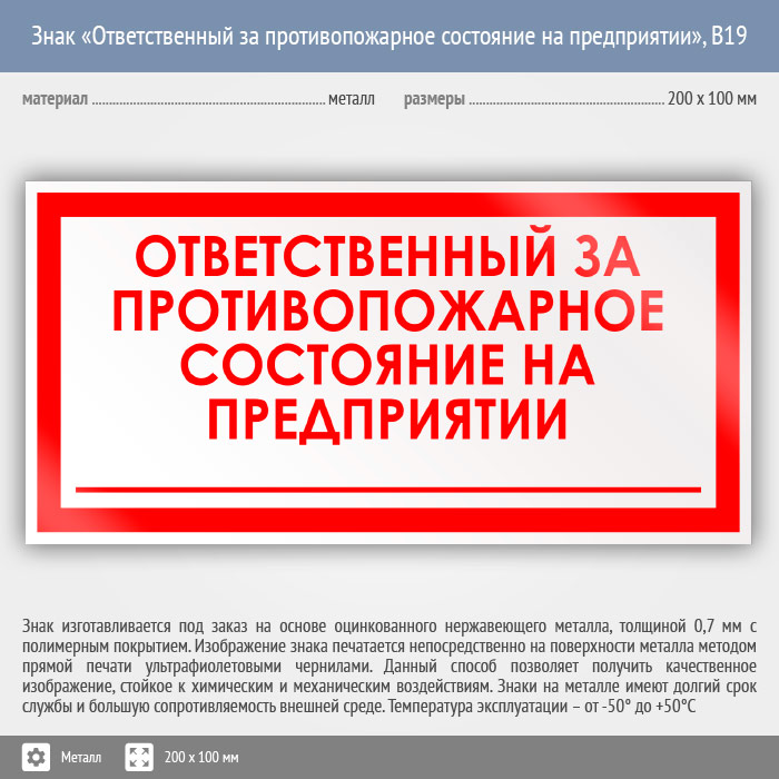 Знак «Ответственный за противопожарное состояние на предприятии», B19 (металл, 200х100 мм) в Верее купить