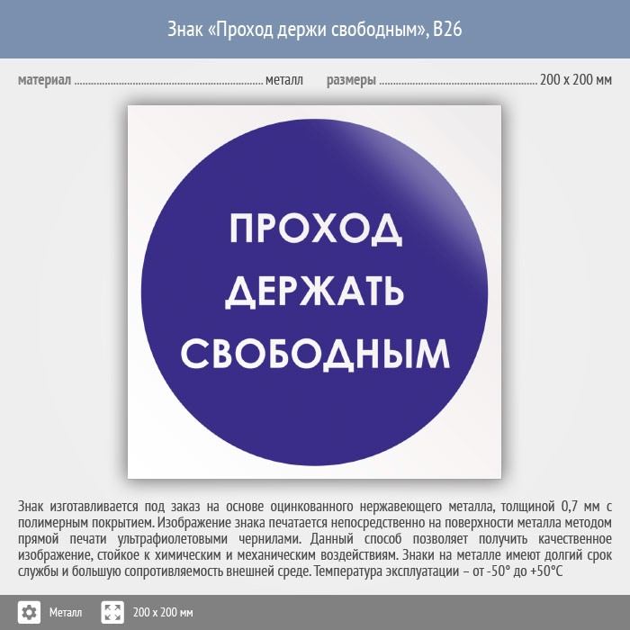 Знак «Проход держи свободным», B26 (металл, 200х200 мм) в Верее купить