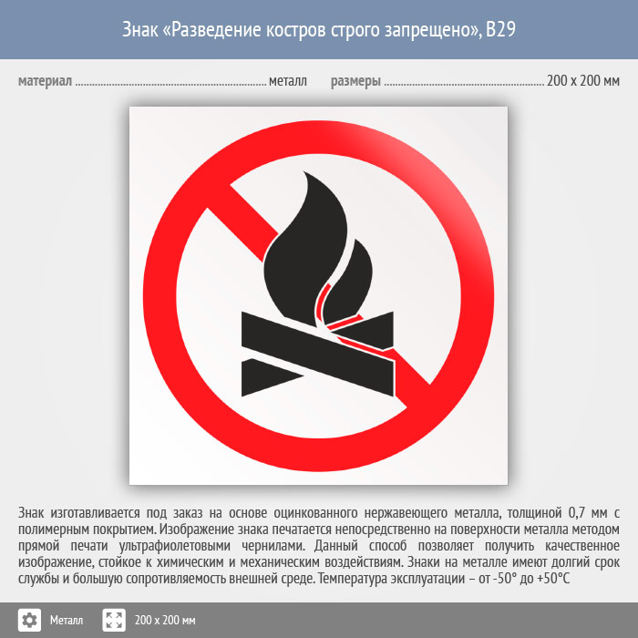 Знак «Разведение костров строго запрещено», B29 (металл, 200х200 мм) в Верее купить
