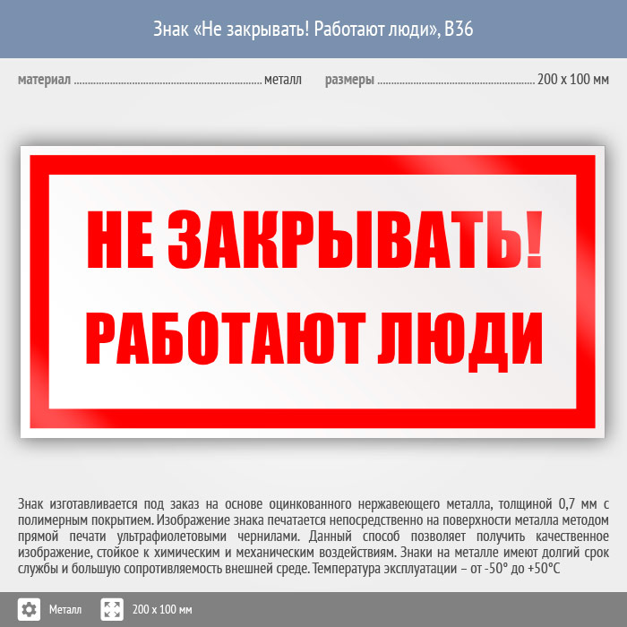 Знак «Не закрывать! Работают люди», B36 (металл, 200х100 мм) в Верее купить