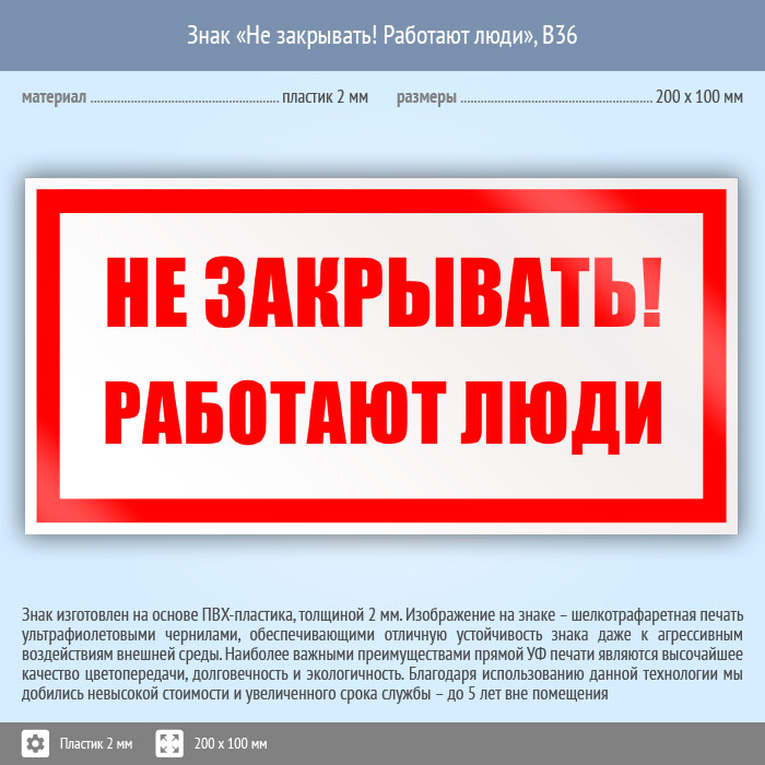 Знак «Не закрывать! Работают люди», B36 (пластик, 200х100 мм) в Верее купить