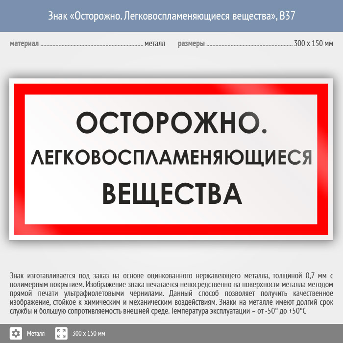 Знак «Осторожно. Легковоспламеняющиеся вещества», B37 (металл, 300х150 мм) в Верее купить