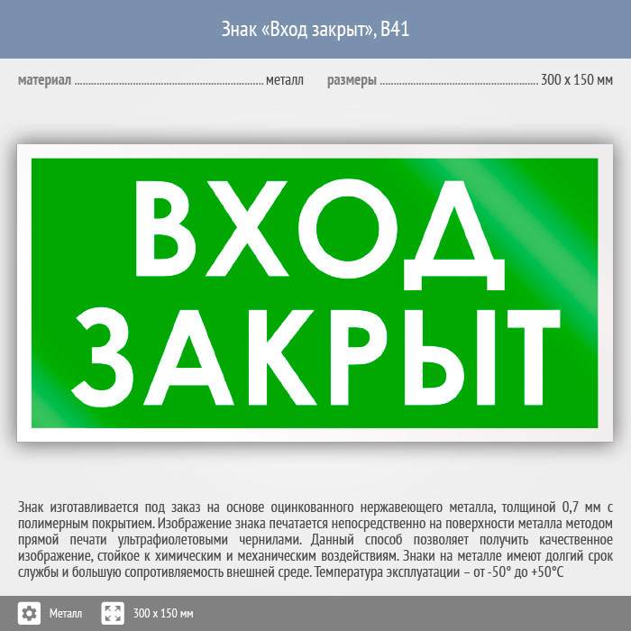 Знак «Вход закрыт», B41 (металл, 300х150 мм) в Верее купить