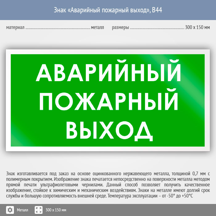 Знак «Аварийный пожарный выход», B44 (металл, 300х150 мм) в Верее купить