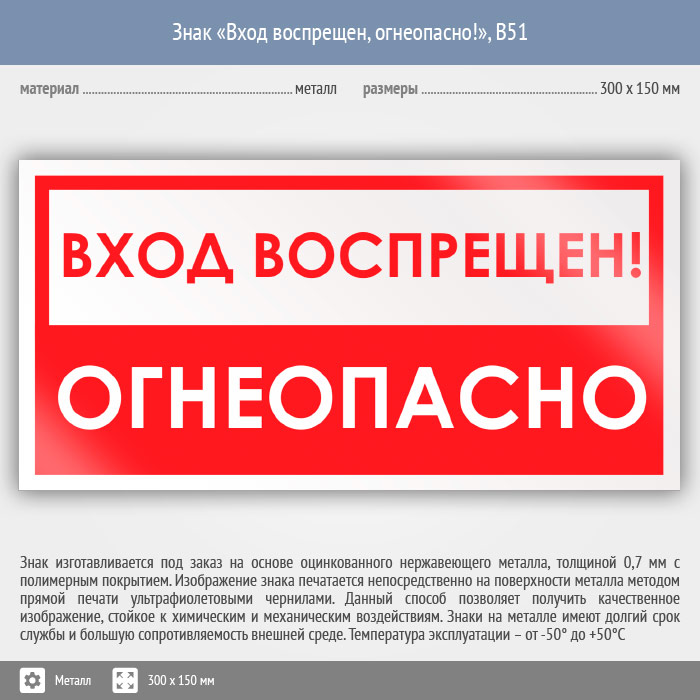 Знак «Вход воспрещен, огнеопасно!», B51 (металл, 300х150 мм) в Верее купить