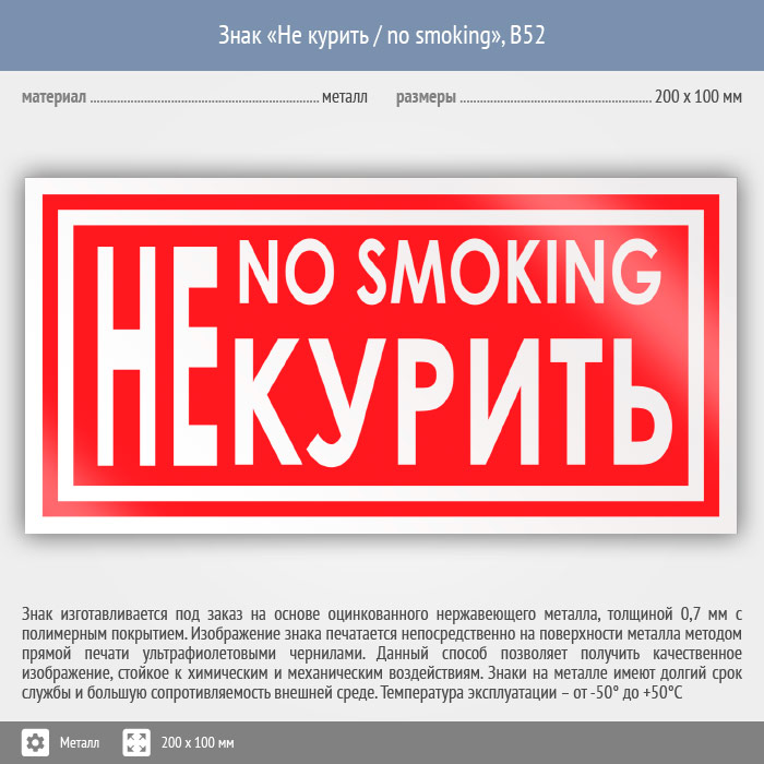 Знак «Не курить / no smoking», B52 (металл, 200х100 мм) в Верее купить