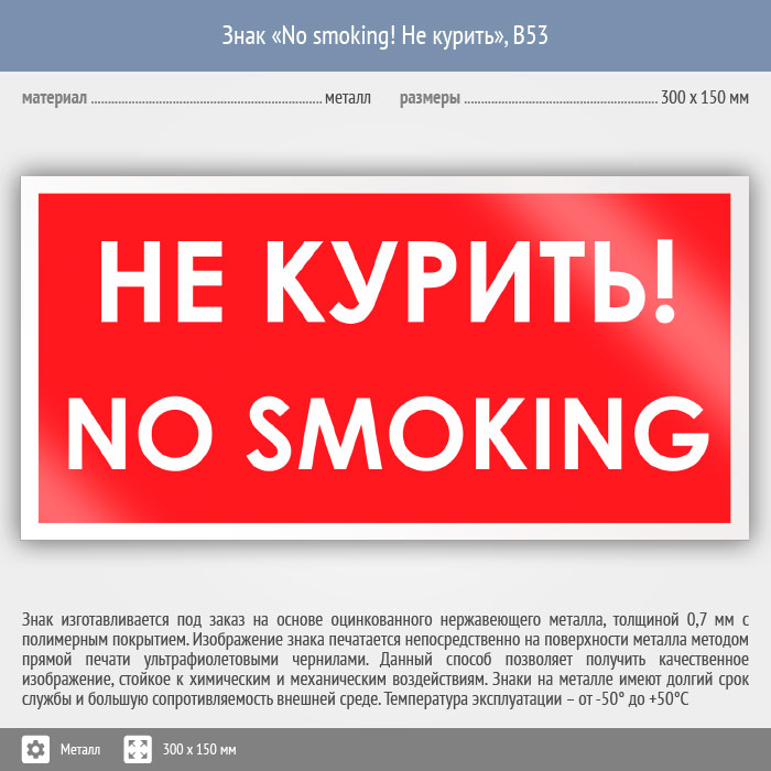 Знак «No smoking! Не курить», B53 (металл, 300х150 мм) в Верее купить