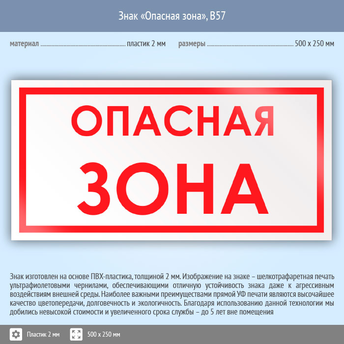 Знак «Опасная зона», B57 (пластик, 500х250 мм) в Верее купить