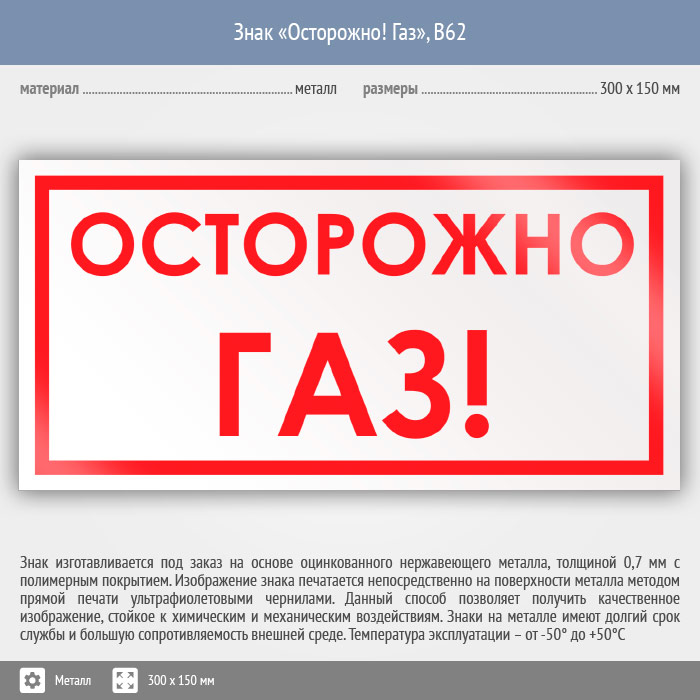 Знак «Осторожно! Газ», B62 (металл, 300х150 мм) в Верее купить