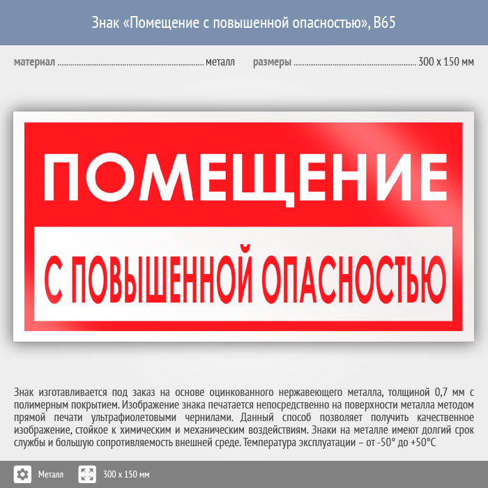 Знак «Помещение с повышенной опасностью», B65 (металл, 300х150 мм) в Верее купить