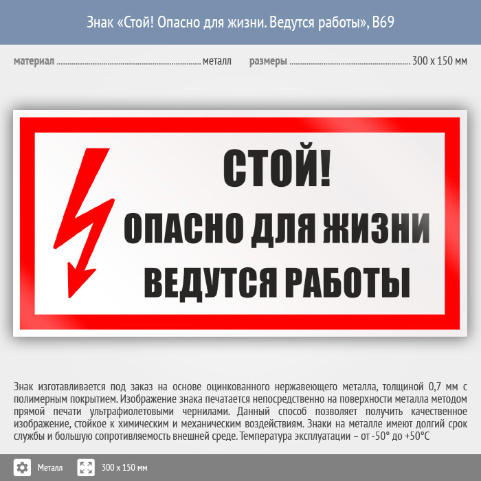 Знак «Стой! Опасно для жизни. Ведутся работы», B69 (металл, 300х150 мм) в Верее купить