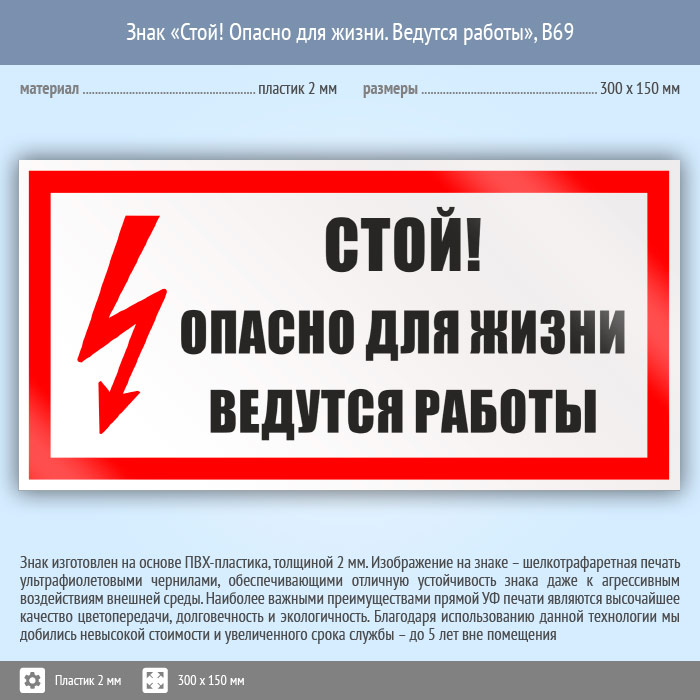 Знак «Стой! Опасно для жизни. Ведутся работы», B69 (пластик, 300х150 мм) в Верее купить