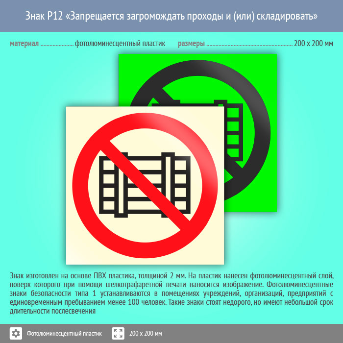 Знак P12 «Запрещается загромождать проходы и (или) складировать» (фотолюминесцентный пластик, 200х200 мм) в Верее купить