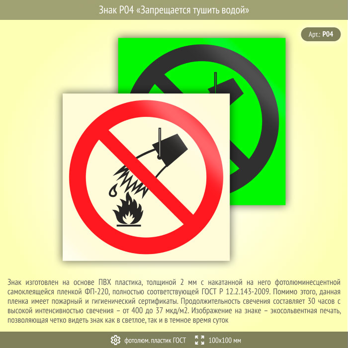 Знак P04 «Запрещается тушить водой» (фотолюминесцентный пластик ГОСТ 34428-2018, 100х100 мм) в Верее купить