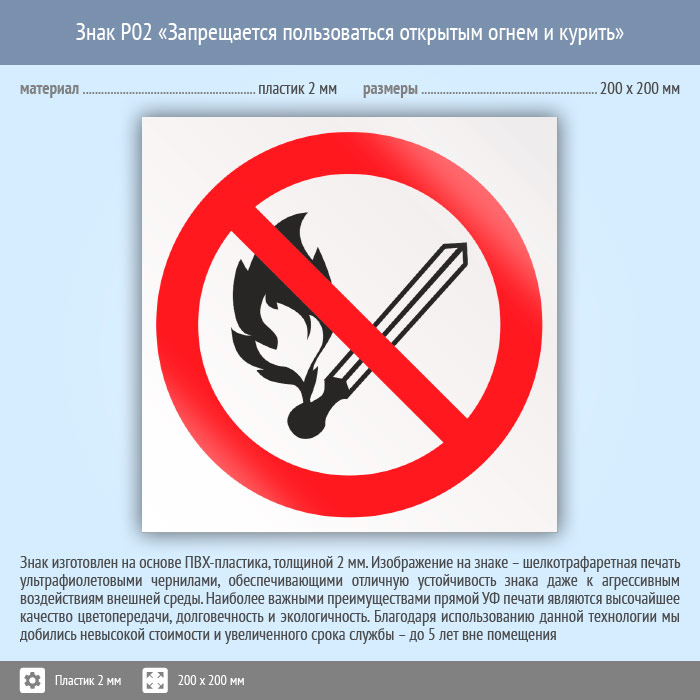 Знак P02 «Запрещается пользоваться открытым огнем и курить» (пластик, 200х200 мм) в Верее купить