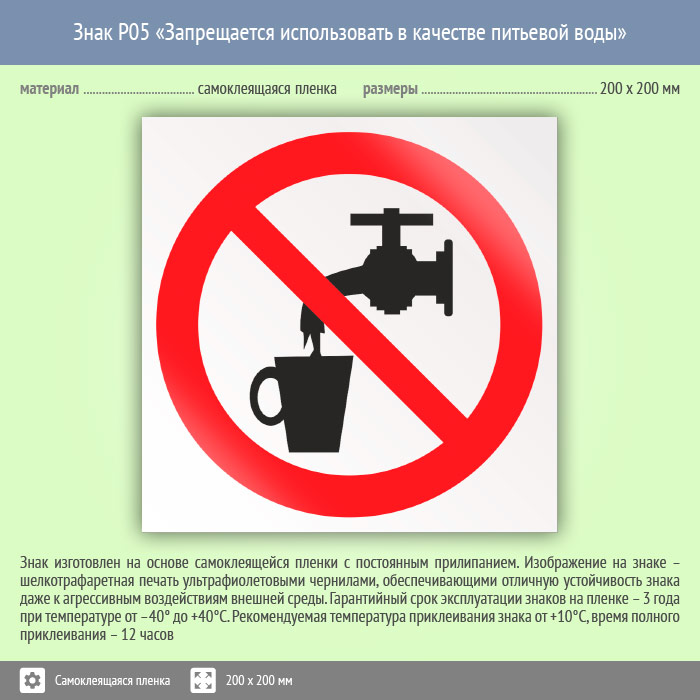 Знак P05 «Запрещается использовать в качестве питьевой воды» (пленка, 200х200 мм) в Верее купить