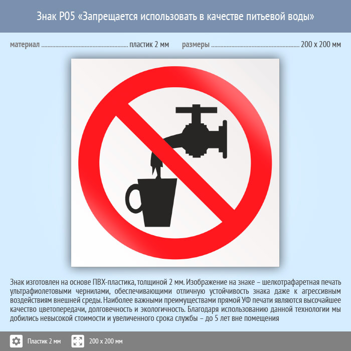 Знак P05 «Запрещается использовать в качестве питьевой воды» (пластик, 200х200 мм) в Верее купить