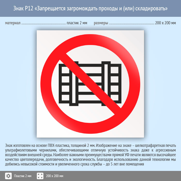 Знак P12 «Запрещается загромождать проходы и (или) складировать» (пластик, 200х200 мм) в Верее купить