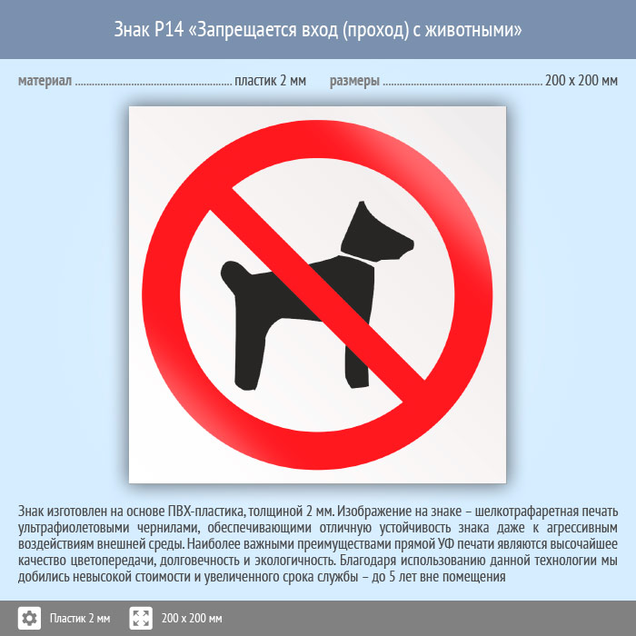 Знак P14 «Запрещается вход (проход) с животными» (пластик, 200х200 мм) в Верее купить