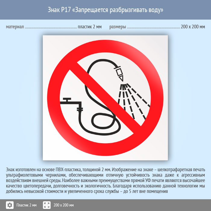 Знак P17 «Запрещается разбрызгивать воду» (пластик, 200х200 мм) в Верее купить