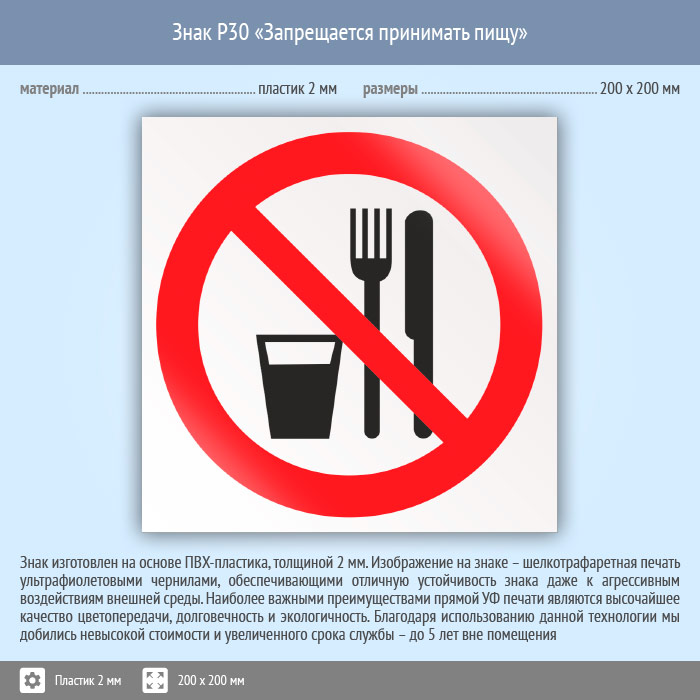 Знак P30 «Запрещается принимать пищу» (пластик, 200х200 мм) в Верее купить