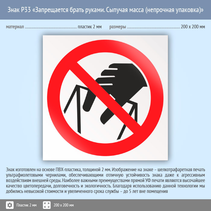 Знак P33 «Запрещается брать руками. Сыпучая масса (непрочная упаковка)» (пластик, 200х200 мм) в Верее купить