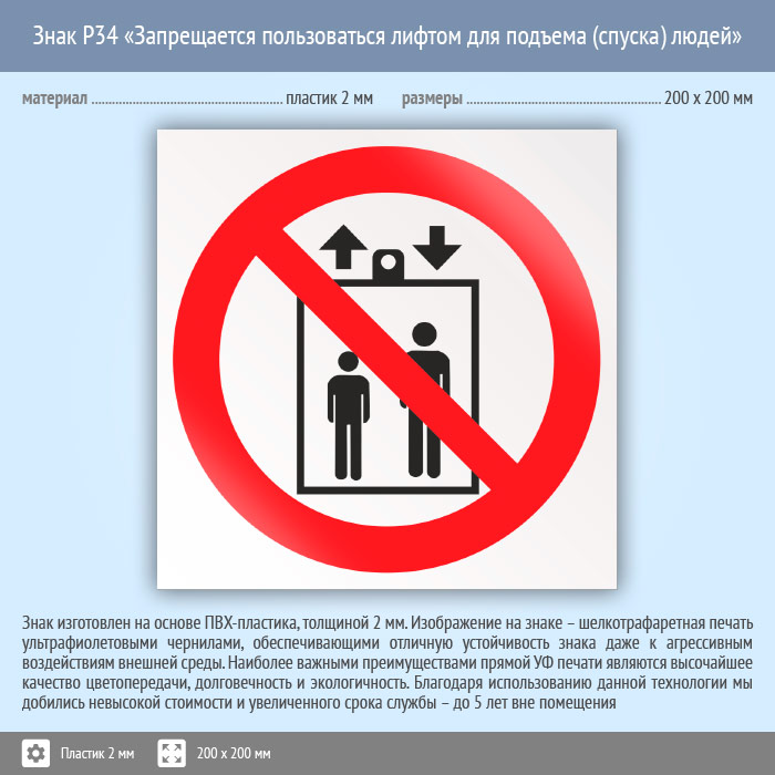 Знак P34 «Запрещается пользоваться лифтом для подъема (спуска) людей» (пластик, 200х200 мм) в Верее купить