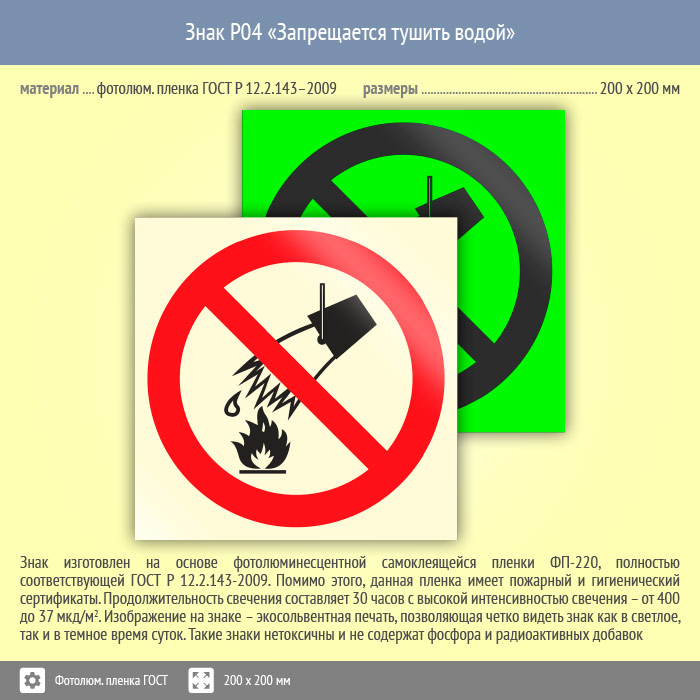 Знак P04 «Запрещается тушить водой» (фотолюминесцентная пленка ГОСТ 34428-2018, 200х200 мм) в Верее купить