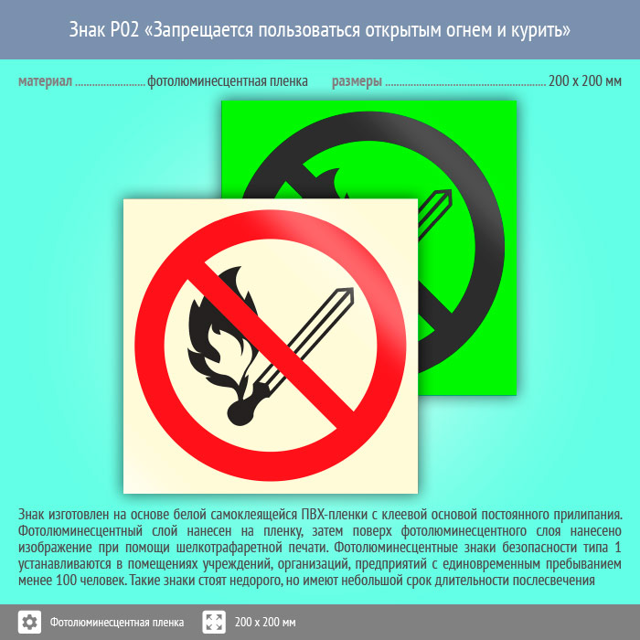 Знак P02 «Запрещается пользоваться открытым огнем и курить» (фотолюминесцентная пленка, 200х200 мм) в Верее купить