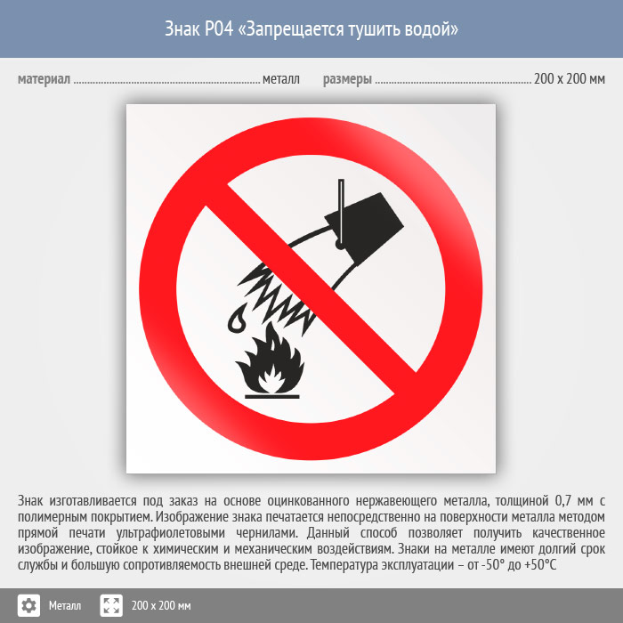 Знак P04 «Запрещается тушить водой» (металл, 200х200 мм) в Верее купить