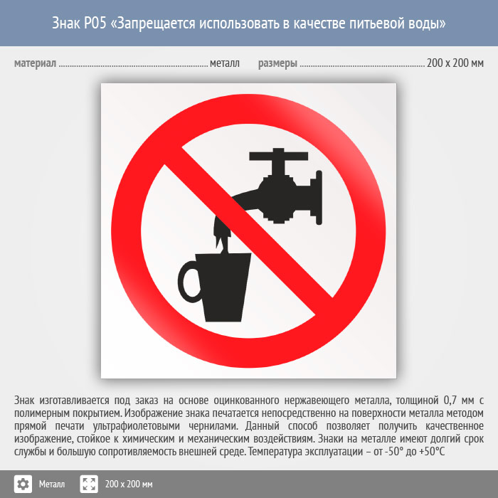 Знак P05 «Запрещается использовать в качестве питьевой воды» (металл, 200х200 мм) в Верее купить