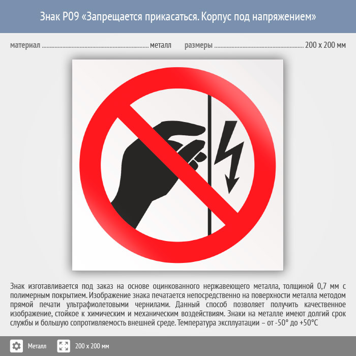 Знак P09 «Запрещается прикасаться. Корпус под напряжением» (металл, 200х200 мм) в Верее купить