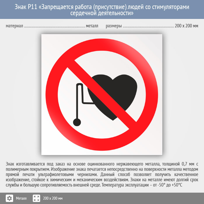 Знак P11 «Запрещается работа (присутствие) людей со стимуляторами сердечной деятельности» (металл, 200х200 мм) в Верее купить