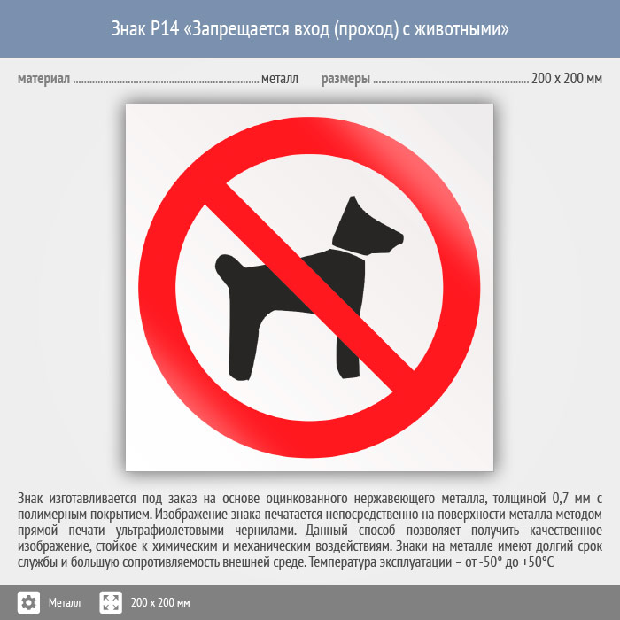 Знак P14 «Запрещается вход (проход) с животными» (металл, 200х200 мм) в Верее купить
