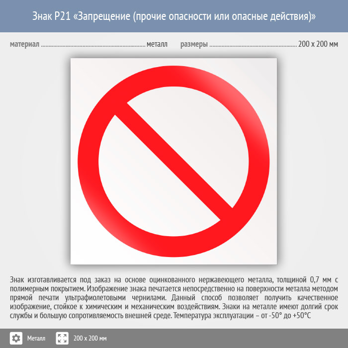 Знак P21 «запрещение (прочие опасности или опасные действия)» (металл, 200х200 мм) в Верее купить